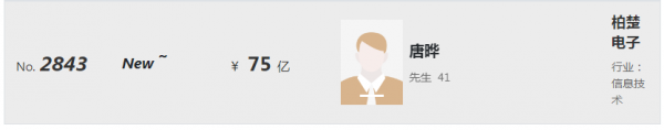 值得一提的是,此次榜單中,柏楚電子董事長唐曄作為(wei) 新麵孔首次登上胡潤全球富豪榜,堪稱激光界的一匹“黑馬”。