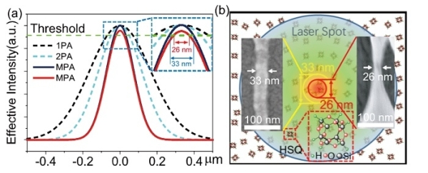 HSQ是一種無機光刻膠,作為(wei) 典型的電子束光刻膠被廣泛應用於(yu) 微納器件的圖形化。由於(yu) 其本征吸收波長短(<200 nm),僅(jin) 有使用真空紫外157 nm波長實現HSQ光學光刻的報道,傳(chuan) 統的深紫外(193 nm)光刻以及可見光波長的激光3D打印技術難以對其進行微結構加工。研究利用飛秒激光與(yu) 物質的非線性相互作用,通過多光子吸收引起的“雪崩電離”效應,實現了HSQ的飛秒激光超衍射納米光刻,突破了前人提出的HSQ無法使用可見和近紅外光進行光刻微加工的局限。研究通過精確控製激光焦點處的光場分布,探索了閾值效應對飛秒激光超衍射納米光刻技術加工的HSQ微結構特征尺寸的影響規律。隨著HSQ同時吸收光子數的增加,有效光強分布曲線變得越來越窄,同時越來越陡峭。當飛秒激光的能量逐漸逼近閾值能量時,會(hui) 得到具有極小特征尺寸的HSQ結構。研究人員剖析了激光能量、掃描速度和掃描方式等加工參數對特征尺寸的影響規律,通過精細調節激光的加工參數,得到了自支撐的33 nm 和26 nm HSQ納米結構,實現了λ/30的特征尺寸,為(wei) 基於(yu) HSQ微結構的新型無機納米器件的研究奠定了基礎。