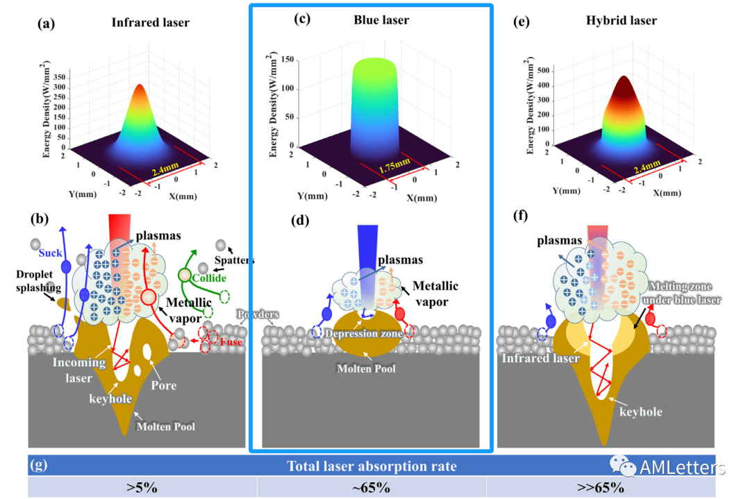 (2)高反金屬對紅外激光的吸收率低,所以加工時需要較高的功率,但高功率的激光會(hui) 導致熔池穩定性較差。藍光激光的波長較短,高反金屬對其的吸收率高,但藍色激光器的功率較低,導致零件的致密度較差。通過將高功率紅外激光和低功率藍色激光複合,可以有效解決(jue) 以上兩(liang) 個(ge) 問題。