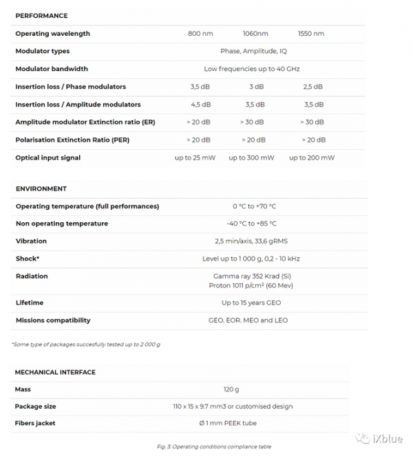 地球-衛星通信和星間通信是iXblue參與(yu) 的空間領域應用之一。iXblue Photonics 具有十多年的宇航項目經驗,參與(yu) 了包括LEO衛星、GEO衛星、國際空間站在內(nei) 的20多個(ge) 項目,為(wei) 全球不同的宇航用戶(含航天機構)提供了200多個(ge) 調製器。iXblue提供850nm、1064nm和1550nm強度調製器和相位調製器,作為(wei) 宇航應用中模樣件(BBM)、工程件(EM)、鑒定件(QM)和正樣(FM)等,請參考我們(men) 的應用手冊(ce) Space grade modulators definitions,或者聯係我們(men) 了解更多信息。