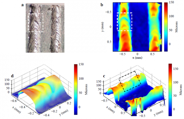 圖2:a 鋁合金熔融軌跡實際照片;b 雙波長全息術測量的鋁合金熔融軌跡;c 雙波長全息術測量的鋁合金熔融軌跡3D 形態;d 局部圖(b中白色框出的區域)圖 2 對比結果表明了雙波長全息術對熔融軌跡 3D 形貌測量的可靠性。熔融軌跡中的人字形結構清晰可見。