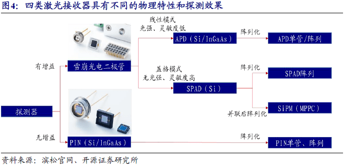 激光接收:探測器的靈敏度、是否能獲得光強信息、價(jia) 格、接收器的信息處理效率都是廠商需要斟酌的內(nei) 容。接收元器件通常有三類,PIN光電二極管、工作在線性模式下的雪崩二極管(APD)、工作在蓋革模式下的雪崩二極管(SPAD,亦稱為(wei) 單光子探測器)。在905nm波段,SPAD的工作電壓低,可采用低壓電路,價(jia) 格低廉,靈敏度高,且後端的處理電路相對APD更簡單,采用陣列化的方式,探測效果逐步可以媲美甚至超越APD,未來將逐步替代APD。在1550nm波段,銦磷半導體(ti) 製備難度高導致銦镓砷SPAD產(chan) 品不成熟,廠商通常使用線性APD或者線性APD陣列作為(wei) 探測元件,成本較高。