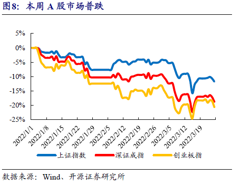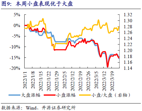 市場表現:本周(指3月21日至3月25日)上證綜指收於(yu) 3212點,下跌1.19%;深證成指收於(yu) 12073點,下跌2.08%;創業(ye) 板指收於(yu) 2638點,下跌2.80%。大小盤風格方麵,本周大盤指數下跌2.16%,小盤指數下跌1.04%。2022年以來大盤指數累計下跌15.46%,小盤指數累計下跌15.16%,小盤/大盤比值為(wei) 1.28。
