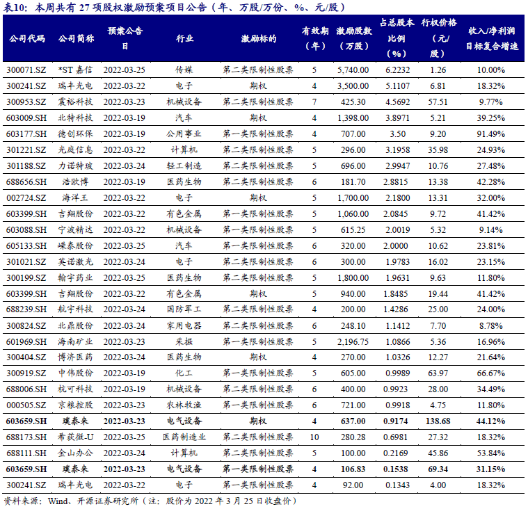 本周重大事項:3月23日,璞泰來發布股票期權與(yu) 限製性股票激勵計劃,其中股票期權的激勵總股數637萬(wan) 股,激勵總數占當時總股本比例0.92%,行權價(jia) 格138.68元/股。本激勵計劃業(ye) 績考核目標為(wei) :2022、2023、2024年公司淨利潤分別不低於(yu) 26、40和54億(yi) 元。其中限製性股票激勵的激勵總股數106.83萬(wan) 股,激勵總數占當時總股本比例0.15%,股票轉讓價(jia) 格68.34元/股。激勵計劃業(ye) 績考核目標為(wei) :2022、2023、2024年公司營業(ye) 收入分別不低於(yu) 125、165和215億(yi) 元。