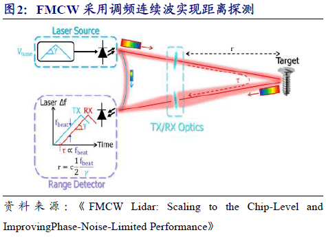 測距原理:TOF主流,FMCW潛力大。目前TOF測距方式簡單可靠,成熟易於(yu) 實現,是當前主流的測距方式。FMCW性能優(you) 異,具有極高的性價(jia) 比、抗幹擾性、低發射功率、容易芯片化、且可呈現速度信息。但FMCW技術仍然不成熟,其激光發射器需要窄線寬。需要精密的激光調製器和經過改良的激光接收器。目前少有可以量產(chan) 的產(chan) 品。這其中激光雷達公司Avea走在前列,已經推出集成激光發射/接收/光學元器件等的矽光芯片,激光雷達產(chan) 品有望在2023年實現量產(chan) 。