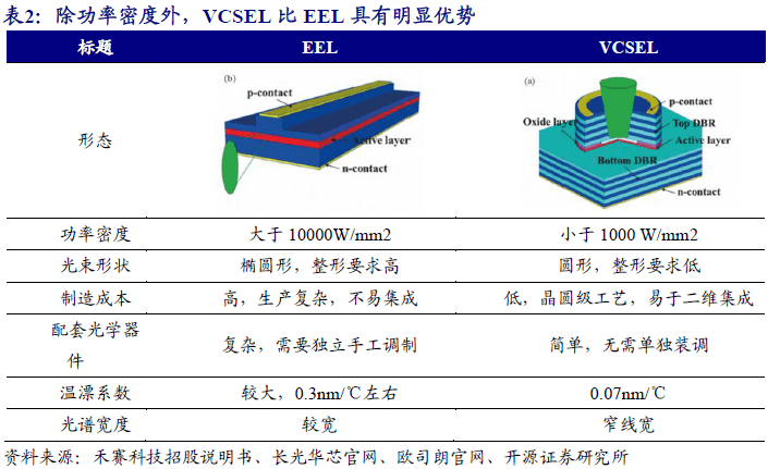 激光發射:EEL憑借高功率密度目前占據主流市場地位,VCSEL性能優(you) 有望逐步擴大自身份額,1550nm波段則以光纖激光器為(wei) 主。激光雷達的激光發射器通常有三種形式:半導體(ti) 邊發射激光器(EEL)、半導體(ti) 垂直腔麵發射激光器(VCSEL)、光纖激光器。通常905nm波長激光可選擇半導體(ti) 激光器。這其中,EEL激光器憑借其成熟的產(chan) 品和供應鏈體(ti) 係,極高的功率密度,成為(wei) 目前主流的形式。VCSEL除功率密度較EEL低外在線寬、溫漂係數、光束形狀等指標上均優(you) 於(yu) EEL,同時成本低廉,未來有望逐步實現對EEL的替代。在1550nm波段,需要采用銦镓砷/磷化銦半導體(ti) ,該材料所製備的半導體(ti) 激光器的發光功率無法滿足要求,通常采用光纖激光器。
