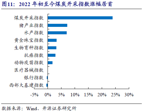 概念板塊方麵,本周生物育種指數表現走強。《種業(ye) 振興(xing) 行動方案》有望在近期印發實施。這是繼1962年出台《關(guan) 於(yu) 加強種子工作的決(jue) 定》後我國再次對種業(ye) 發展做出重要部署,被業(ye) 內(nei) 視為(wei) 中國種業(ye) 的第三次係統性改革升級。包括北京、湖南、江蘇、海南等地在內(nei) 的多個(ge) 省份都在加碼對於(yu) 種業(ye) 發展的支持力度,以期挖掘地區潛力,積極補齊短板。本周生物育種指數和豬產(chan) 業(ye) 指數分別上漲7.75%和6.61%。綜合2022年以來情況看,煤炭開采指數累計上漲23.94%,漲幅居首。