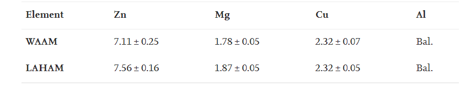 表3 WAAM和LAHAM樣品的主要元素含量(wt%)。