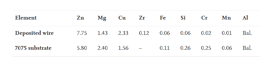 本研究使用的鍍絲(si) 為(wei) 直徑1.2 mm的定製Al-Zn-Mg-Cu合金。在7075鋁合金基板上采用單向沉積法逐層沉積金屬絲(si) 。對基材表麵的氧化物和雜質進行機械清洗,然後進行丙酮脫脂。用x射線熒光光譜法(XRF)測量導線和基板的化學成分,如表1所示。