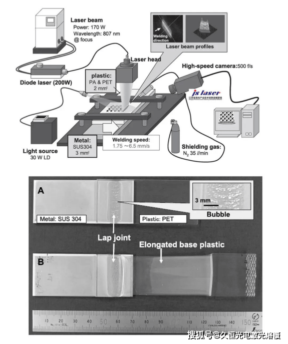 圖5 激光直接接焊接金屬與(yu) 塑料(上)和焊接PET與(yu) 304不鏽鋼的實物圖(下)