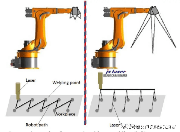 圖7 傳(chuan) 統激光焊接(左圖)和遠程焊接的軌跡示意圖(右圖)