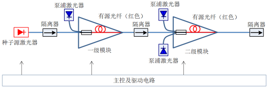在光纖激光器中,隔離器主要被用來避免光路中的回波對光源、泵浦源以及其他發光器件造成幹擾和損傷(shang) 。以脈衝(chong) 光纖激光器為(wei) 例,其主要由種子源激光器、隔離器、泵浦激光器、有源光纖等部件構成。隔離器主要用於(yu) 激光器各級之間光隔離,使得光脈衝(chong) 單向傳(chuan) 輸,避免反射光損傷(shang) 激光器。其中種子源與(yu) 一級放大器之間的光纖隔離器用於(yu) 保護種子源激光器;一級與(yu) 二級放大器之間的隔離器用於(yu) 保護一級放大器;輸出隔離器為(wei) 光纖輸入、空間準直光輸出隔離器,用於(yu) 將光纖內(nei) 的激光器轉換為(wei) 空間準直光束輸出,並隔離回返光,保護二級放大器。