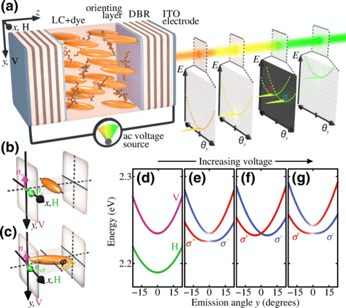 在軍(jun) 事科技大學獲得的激光微腔內(nei) 分子的精確排列,導致了腔內(nei) 出現兩(liang) 種線偏振光模式。電場改變了光腔內(nei) 分子的方向,從(cong) 而改變了液晶層的有效折射率。因此,它控製所謂的光路的長度——光腔寬度和折射率的乘積,而折射率是發射光的能量(顏色)所依賴的。其中一種模態的能量不隨分子旋轉而改變,而另一種模態的能量則隨分子方向的改變而增加。