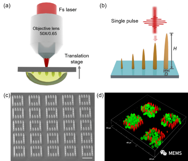 據麥姆斯谘詢報道,近日,中國科學院沈陽自動化研究所在飛秒激光微納加工及生物學應用取得新進展。飛秒激光微納加工與(yu) 雙光子4D打印是微納米機器人課題組新開辟的研究方向,旨在利用飛秒激光超快加工開展生物界麵調控與(yu) 柔性腦機接口研究,為(wei) 生命科學和腦科學研究提供新的使能技術。