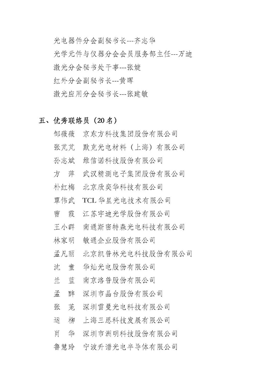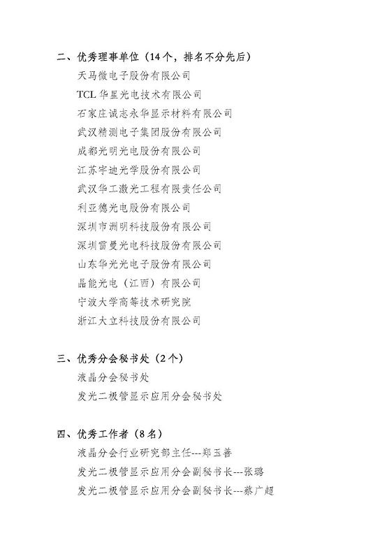 01、優(you) 秀會(hui) 員單位(28個(ge) ) 維信諾科技股份有限公司 北京集創北方科技股份有限公司 重慶惠科金渝光電科技有限公司 默克光電材料(上海)有限公司 康寧顯示科技(中國)有限公司 東(dong) 電電子(上海)有限公司 北京欣奕華科技有限公司 江蘇和成顯示科技股份有限公司 杉金光電(南京)有限公司 長春奧普光電技術有限公司 長春博信光電子有限公司 天通控股股份有限公司 北京凱普林光電科技有限公司 上海三思電子工程有限公司 南京洛普股份有限公司 深圳市奧拓電子股份有限公司 深圳市艾比森光電股份有限公司 長春希達電子技術有限公司 西安青鬆光電技術有限公司 華燦光電股份有限公司 佛山市國星光電股份有限公司 西安諾瓦星雲(yun) 科技股份有限公司 圓融光電科技股份有限公司 杭州士蘭(lan) 明芯科技有限公司 深圳市晶台股份有限公司 南京波長光電科技股份有限公司 浙江紅相科技股份有限公司 寧波舜宇紅外技術有限公司 02、優(you) 秀理事單位(14個(ge) ) 天馬微電子股份有限公司 TCL華星光電技術有限公司 石家莊誠誌永華顯示材料有限公司 武漢精測電子集團股份有限公司 成都光明光電股份有限公司 江蘇宇迪光學股份有限公司 武漢華工激光工程有限責任公司 利亞(ya) 德光電股份有限公司 深圳市洲明科技股份有限公司 深圳雷曼光電科技股份有限公司 山東(dong) 華光光電子股份有限公司 晶能光電(江西)有限公司 寧波大學高等技術研究院 浙江大立科技股份有限公司 03、優(you) 秀分會(hui) 秘書(shu) 處(2個(ge) ) 液晶分會(hui) 秘書(shu) 處 發光二極管顯示應用分會(hui) 秘書(shu) 處 04、優(you) 秀工作者(8名) 液晶分會(hui) 行業(ye) 研究部主任鄭玉善 發光二極管顯示應用分會(hui) 副秘書(shu) 長張璐 發光二極管顯示應用分會(hui) 副秘書(shu) 長蔡廣超 光電器件分會(hui) 副秘書(shu) 長齊誌華 光學元件與(yu) 儀(yi) 器分會(hui) 會(hui) 員服務部主任萬(wan) 迪 激光分會(hui) 秘書(shu) 處幹事張婕 紅外分會(hui) 副秘書(shu) 長黃暉 激光應用分會(hui) 秘書(shu) 長張建敏 05、優(you) 秀聯絡員(20名) 鄒薇薇 京東(dong) 方科技集團股份有限公司 張芃芃 默克光電材料(上海)有限公司 孫誌斌 維信諾科技股份有限公司 方 萍 武漢精測電子集團股份有限公司 樸紅梅 北京欣奕華科技有限公司 覃偉(wei) 武 TCL華星光電技術有限公司 曹 霞 江蘇宇迪光學股份有限公司 王小群 南通斯密特森光電科技有限公司 林家明 敏通企業(ye) 股份有限公司 孟凡麗(li) 北京凱普林光電科技股份有限公司 沈 童 華燦光電股份有限公司 蘭(lan) 藍 南京洛普股份有限公司 孟 醉 深圳市晶台股份有限公司 張 蘢 深圳雷曼光電科技有限公司 運 柳 上海三思科技發展有限公司 肖 華 深圳市洲明科技股份有限公司 魯慧玲 寧波升譜光電半導體(ti) 有限公司 邵逸愷 北京控製工程研究所 趙克星 昆明雲(yun) 鍺高新技術有限公司 吳 迪 國家紅外及工業(ye) 電熱產(chan) 品質量監督檢驗中心