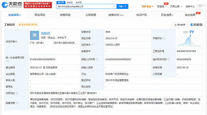 據天眼查App顯示,4月12日,深圳市大族和光科技有限公司成立,法定代表人為(wei) 周桂兵,注冊(ce) 資本2450萬(wan) 元。公司經營範圍包括增材製造裝備銷售;智能控製係統集成;工業(ye) 機器人銷售;機械設備租賃;工業(ye) 互聯網數據服務等。股東(dong) 信息顯示,該公司由大族激光科技產(chan) 業(ye) 集團股份有限公司全資控股。