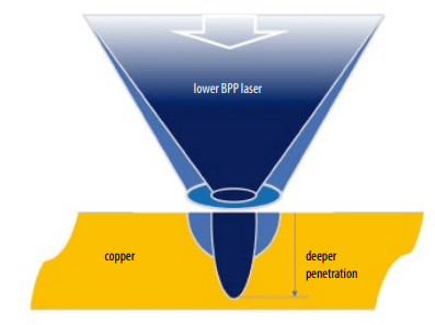 BPP越低,光斑尺寸越小,因此功率密度越高。這會(hui) 導致更深的滲透和/或更快的焊接。