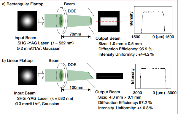非球麵光束整形器可以在沒有任何衍射損失的情況下產(chan) 生圓形平頂。衍射光束整形器比非球麵光束整形器能產(chan) 生各種各樣的光束形狀。然而,由於(yu) 衍射損耗,衍射效率通常為(wei) 80%至95%。圖2顯示了一個(ge) 非球麵光束整形器的示例,該整形器從(cong) 直徑為(wei) 10 mm 1/e2的單模綠光激光器中產(chan) 生一個(ge) 直徑為(wei) 65µm 1/e2的小平頂光斑,其中心長度為(wei) 200mm。通過光線跟蹤優(you) 化整形器的旋轉對稱非球麵,以滿足這些要求。圖1中的重映射原理表明,輸入光束的大小、輪廓或偏心的任何變化都不再保持輸出光束均勻分布的平衡。當輸入光束尺寸的規格發生變化時,應相應地再次優(you) 化和修改非球麵設計。圖3顯示了用於(yu) 單模綠光激光器的衍射光束整形器(一種DOS)的兩(liang) 個(ge) 示例,其分別產(chan) 生(a)1.0 mm×0.5 mm矩形和(b)4 mm長的線性平頂光束。矩形梁在水平軸和垂直軸上具有平頂輪廓。在這種情況下,線光束在短軸上具有0.1毫米1/e2寬度的高斯強度分布。