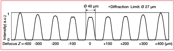 長焦深光束整形器是一種衍射光學器件,其工作方式與(yu) 幾何光束重映射光學器件不同。它將輸入光束分為(wei) +1階(略微收斂)和-1階(略微雙聚)光束。兩(liang) 個(ge) 相反或相反的光束仍在同一光軸上,由f-θ透鏡會(hui) 聚並疊加在焦點上。由於(yu) 兩(liang) 個(ge) 相幹光束之間的光幹涉,在那裏出現了平頂光強分布。光斑形狀原則上是圓形或方形(圖7e–g),但當增加入射光束尺寸時,平頂光束會(hui) 變為(wei) 環形光束(圖7h)。雖然邊緣輪廓的輪廓不像光束重映射得到的輪廓那麽(me) 銳利,但可以實現更小的光斑尺寸和更長的聚焦深度。