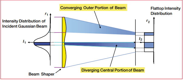 光束整形有幾種光學技術。單模激光器最常用的一種是“幾何光束重映射”,其中光束整形器的功能是通過局部發散或會(hui) 聚入射高斯光束的光束部分來重塑輸出光束輪廓。如圖1所示,具有較高強度的中心部分發散,而較低強度的外部部分會(hui) 聚。基於(yu) 這種想法,光束被分割成更小的部分,並在焦平麵上無縫地重新映射,以使輸出強度更平坦。非常重要的是,在光束整形器和焦平麵之間沒有光束部分(或部分)相互交叉,這意味著它們(men) 永遠不會(hui) 疊加在焦平麵上。