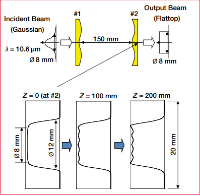 為(wei) 了減少光束傳(chuan) 輸過程中平頂輪廓的退化,平頂光束的波前誤差應通過光束整形器的第二個(ge) 元件進行校正。圖4顯示了輸出“準直”(平波前)平頂光束的兩(liang) 元件型光束整形器的示例。在該圖中,第一個(ge) 非球麵元件(#1)在焦點位置將CO2激光器的高斯光束轉換為(wei) 平頂光束。放置在焦點位置的第二個(ge) 元件(#2)通過平展波前(校正像差)來準直平頂光束。因此,如圖4所示,準直平頂光束可以以較小的強度變化傳(chuan) 播很長的距離。