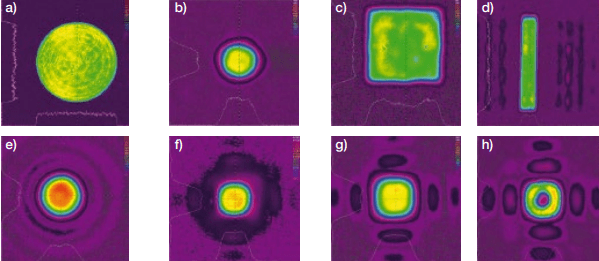 圖7從(cong) a) - d)幾何光束映射整形器或e) - h)長焦深光束整形器輸出光束的測量強度分布圖示例。