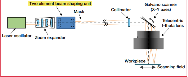 使用X-Y振鏡和f-θ透鏡進行光束掃描在廣泛的工業(ye) 應用中變得越來越重要,如電子或其他工業(ye) 中的激光鑽孔、焊接、劃線、標記和退火。波束成形通常與(yu) 波束掃描係統相結合,如圖5所示。上述雙元件光束整形器可用於(yu) 在光學掩模上照射準直平頂光束。光束整形器前麵的變焦擴展器可以輕鬆調整輸入光束的直徑和發散度。輸出光束被掩模切斷,然後由遠心f-θ透鏡在工件上成像,其尺寸在預定放大率下減小。遠心f-θ透鏡的設計具有像側(ce) 遠心,即每束光束幾乎垂直於(yu) 整個(ge) 掃描場照射工作表麵。盡管非遠心透鏡通常具有更大的掃描場,但這種類型的透鏡是首選的高性能精密加工透鏡之一。由於(yu) 整形器的輸出光束是平頂的,以適應掩模的孔徑形狀,因此減少了激光束的截止損耗,並相應地提高了能量利用效率。在另一方麵,具有平坦強度的圖像光斑可以減少工件損傷(shang) 。因為(wei) 高斯分布的中心峰值強度有時會(hui) 在刻劃薄膜層時損壞工作基板。
