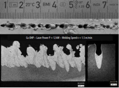 對比基本焊接參數(聚焦位置在表麵上,無光束振蕩)。使用的銅是一種磷還原銅,具有高殘留磷Cu DHP。在焊接速度為(wei) 1.5 m/min時,焊接金屬的噴射完全可以避免,峰值功率為(wei) 16 kW。大氣壓下的對比焊接試驗顯示了典型的焊接缺陷。