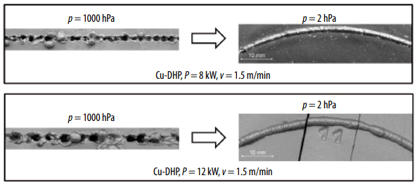 基本對比(圖4)說明了壓力降低對焊縫金屬彈射形成的影響。對銅DHP焊接參數和焊接工藝開發的更詳細研究,包括垂直於(yu) 焊接方向的激光束的振蕩,證明了工藝變量熔岩在3至10 mm以上板厚範圍內(nei) 焊接銅的全部潛力。