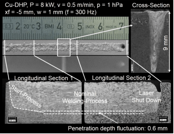 通過將環境壓力降低到0.1 hPa的範圍,可以顯著提高銅在相對較低焊接速度水平下的激光束焊接過程穩定性。即使在0.5到2 m/min的焊接速度範圍內(nei) ,也可以完全防止焊縫金屬噴射。焊接參數“焦點位置”和垂直於(yu) 焊接方向的激光束振蕩已被證明會(hui) 對內(nei) 部焊縫幾何形狀和焊縫質量(孔隙率、焊縫金屬噴射、飛濺)產(chan) 生巨大影響。