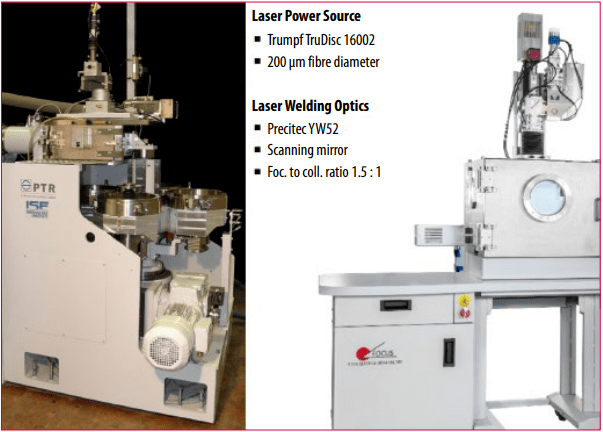 大多數係統采用帶有外部焊接光學元件的設計。這方麵的一個(ge) 關(guan) 鍵部分是保護窗口,它允許將激光束耦合到腔室中,使其免受過程排放物的影響。通過應用合適的係統(ISF development“Optishield”),窗口中聯軸器的壽命可以增加到每個(ge) 窗口1000次以上的焊接試驗。在與(yu) 工業(ye) 夥(huo) 伴PTR Strahltechnik(4腔室分度機,圖3左側(ce) )和Focus GmbH(多用途機,圖3右側(ce) )的密切合作下,已經開發出了兩(liang) 種用於(yu) 工業(ye) 應用的lava -焊機概念。