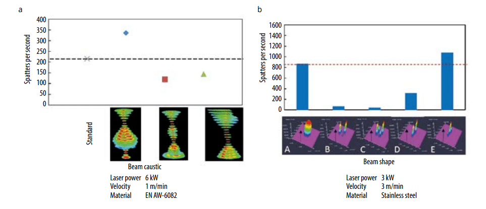 對於(yu) 軸向形狀的光束(圖4a),可以看出,與(yu) 單點布置相比,在較低的小孔區域,隨著激光束強度的增加,聚焦深度更均勻,支持穩定的過程並減少飛濺。