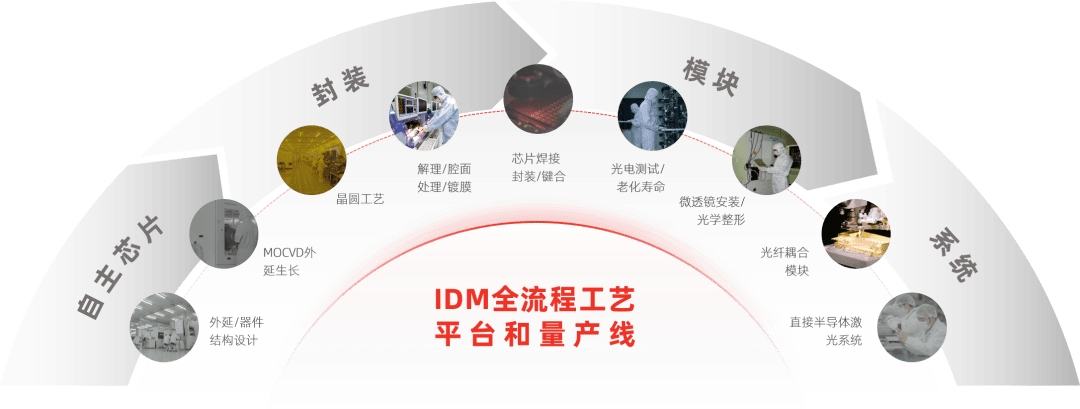 長光華芯致力於(yu) 研發和生產(chan) 高功率半導體(ti) 激光芯片,擁有數年規模化量產(chan) 經驗,建成了完全自主可控的從(cong) 芯片設計、MOCVD(外延)、FAB晶圓流片、解理/鍍膜、封裝、測試、光學耦合、直接半導體(ti) 激光器等完整的工藝平台和量產(chan) 線,是全球少數幾家具備6吋線外延、晶圓製造等關(guan) 鍵製程生產(chan) 能力的IDM半導體(ti) 企業(ye) 。