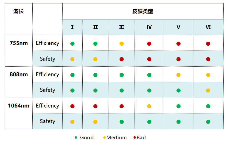人類皮膚通常分為(wei) 6種類型,白皮膚為(wei) Ⅰ、Ⅱ型,黃皮膚為(wei) Ⅲ、Ⅳ型,棕黑皮膚為(wei) Ⅴ、Ⅵ型。從(cong) 安全性及避免副作用的角度,當皮膚顏色分型為(wei) ( I ~ IV) 型時,可選擇的範圍較廣,使用808nm半導體(ti) 激光,755nm翠綠寶石激光均有效果,但是755波長較短,對於(yu) 皮膚傷(shang) 害大。當皮膚顏色分型為(wei) ( IV ~ VI) 型時,1064 nm的Nd: YAG激光是最安全的選擇,但對淺色皮膚安全度不是很高,同時考慮到市場上對白皮膚和黃皮膚的需求最大,所以說808nm波長是激光脫毛的“金標準”。