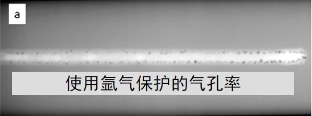 圖2.使用不同保護氣體(ti) 焊接2.0mm不鏽鋼:a)使用氬氣的焊縫X射線結果顯示,熱影響區附近產(chan) 生多個(ge) 氣孔;b)使用氮氣的焊縫X射線結果顯示,焊縫無氣孔。