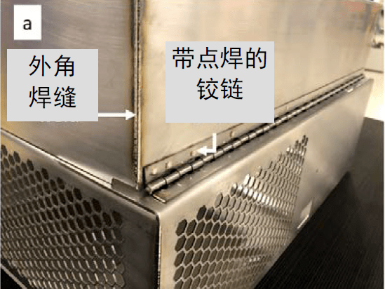 圖1.不鏽鋼激光焊接:a)具有高質量的外角焊縫和點焊鉸鏈;b)使用預設點焊參數將多孔板點焊到外殼上,實現100%的一致性。