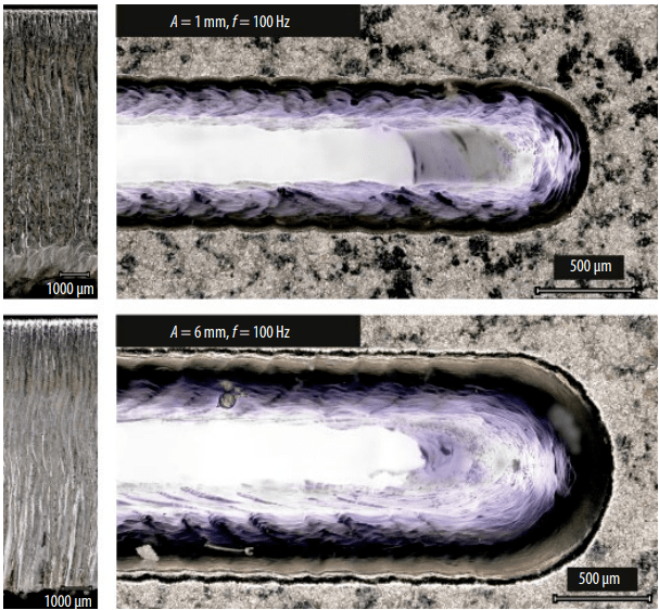 為(wei) 了研究焦平麵振蕩對加工結果的影響,用z-DBS在10 mm厚的板材上進行了切割實驗,作為(wei) 恒定激光功率為(wei) 4 kW的線性切割。振幅在1至6 mm的範圍內(nei) 變化,在100 Hz至1 kHz的頻率下,材料厚度上半部分的零焦點位置。切割速度保持在1.3 m/min的恒定值,以達到每個(ge) 測試參數星座的直通切割。不同振幅值下所選切口幾何形狀的高分辨率顯微圖顯示了該因素對切口形狀和尺寸的強烈影響,見圖5右側(ce) 。特別是,發現上表麵的切口寬度與(yu) 施加的振幅密切相關(guan) 。