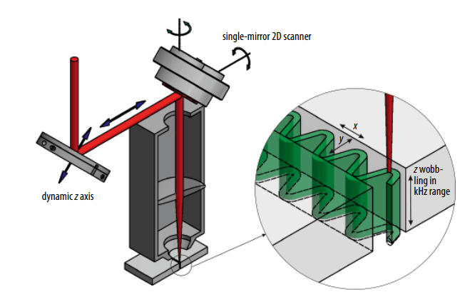 還開發了一種新的快速自適應反射鏡解決(jue) 方案,允許焦平麵沿光束傳(chuan) 播方向在數毫米範圍內(nei) 、頻率高達4 kHz的振蕩,即所謂的z-DBS。該反射鏡預聚焦準直光束的焦距為(wei) 2米,與(yu) 這種切割頭結構相結合時,最大振蕩幅度可達20毫米。快速自適應鏡也可以代替平麵彎曲鏡,為(wei) 整個(ge) 光機械裝置節省了空間和質量(見圖3)。