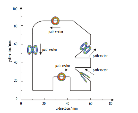 核心元件是控製器,它能夠定義(yi) 兩(liang) 個(ge) 軸之間的頻率、振幅和相移。因此,可以在圓形、八形、馬蹄形、矩形等幾何形狀中獲得各種能量密度分布模式。指定的模式可以與(yu) 沿所需切割輪廓的運動矢量對齊,並且可以根據不斷變化的工藝條件調整振蕩參數,例如方向、切割速度或激光功率的變化。圖2示意性地顯示了2D激光熔合切割控製單元在切割輪廓不同位置生成可自由選擇圖案的能力,以確保一致的切割質量。