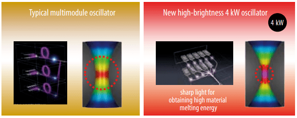 這種LBC技術的效果也被發現適用於(yu) 具有高能量密度的強光。因此,Amada開發了一種單模塊4kW振蕩器,具有高能量密度的強光。傳(chuan) 統的多模組合並輸出由多個(ge) 激光模塊產(chan) 生的光束,使其難以獲得清晰、高亮度的光。新開發的高亮度4千瓦振蕩器與(yu) LBC技術結合使用,與(yu) 傳(chuan) 統方法相比,能夠顯著改善切割性能。