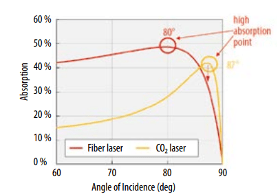 激光束對金屬材料的吸收率隨光束入射角的變化而變化。如圖5所示,吸收率增加時的入射角。