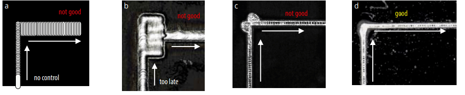 此外,由於(yu) 其動態波束形狀,LBC技術具有定向波束輪廓,這取決(jue) 於(yu) 波束的振蕩模式。這意味著需要旋轉光束的振蕩模式,以匹配切削前進方向。如果圖案沒有旋轉,我們(men) 得到圖7a所示的結果,如果旋轉的時間與(yu) 激光頭的時間不同,我們(men) 得到圖7b所示的結果。即使旋轉是適時的,光束振蕩模式也可能在拐角處產(chan) 生咬合,如圖7c所示。在這些情況下,切割不會(hui) 產(chan) 生所需的形狀,因此Amada還開發了控製技術來防止這些問題。我們(men) 稱之為(wei) 矢量控製技術。矢量控製允許用戶從(cong) 任何切割方向獲得合適的切割形狀(圖7d)。
