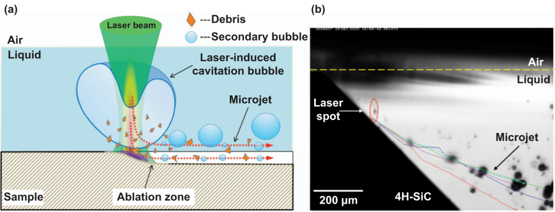 圖1(a)激光誘導微射流輔助燒蝕技術示意圖;(b)高速相機拍攝氣液固界麵附近激光誘導微射流。