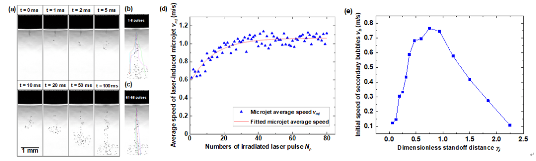 圖2 激光誘導連續微射流的產(chan) 生和演化:(a)100 ms內(nei) 二次氣泡的演化;(b)前5個(ge) 激光脈衝(chong) 誘導的二次氣泡運動軌跡;(c)第61-65個(ge) 脈衝(chong) 誘導二次氣泡的運動軌跡;(d)微射流速度隨著脈衝(chong) 數增加而變化並逐漸趨於(yu) 穩定;(e)激光誘導微射流的初始速度與(yu) 無量綱化激光焦點距離的關(guan) 係。