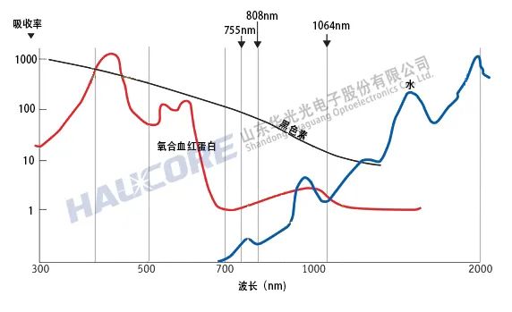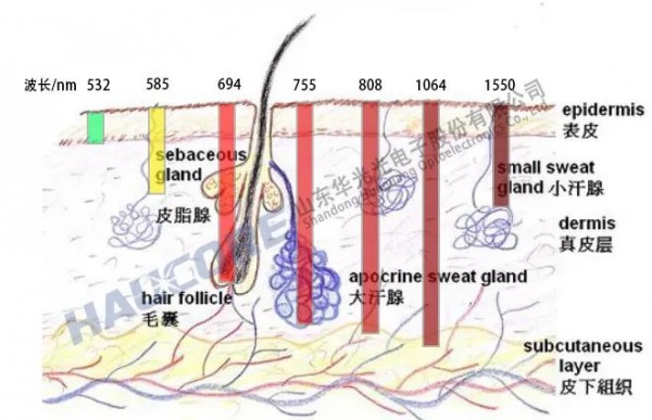 不同的靶組織有其特定的吸收光波,而不同波長的光波又決(jue) 定其在組織中的穿透深度。640nm-1200nm的光才能穿透到毛囊及以下深度,黑色素對各段光波均有良好的吸收,而血紅蛋白對紅光及波長更長的光波吸收率很低,水對短紅外以下的光波吸收極少,因此僅(jin) 有可見光和短紅外波長的激光可以對人體(ti) 進行脫毛。
