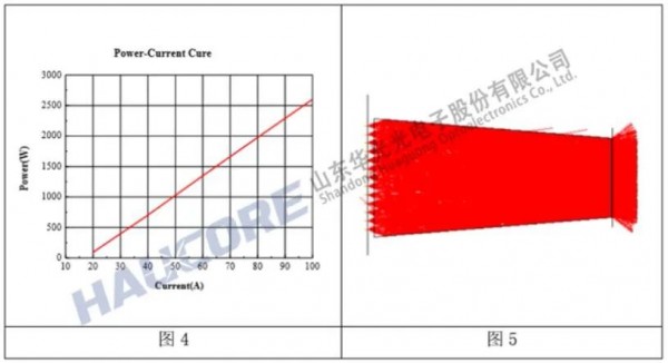 為(wei) 滿足高端市場需求,華光光電近期推出了755nm、808nm、1064nm單波長及三波長2000W、2400W、2600W以及光錐一體(ti) 的宏通道疊陣激光器(圖1), 該宏通道激光器采用了雙排結構,發光區麵積為(wei) 22x30mm(不帶光錐), 其中2600W宏通道疊陣激光器在連續電流測試下的最大輸出功率達到2600W@100A(圖4),波長-電流漂移係數0.15nm/A,達到業(ye) 界領先水平。