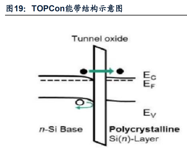 TOPCon產(chan) 線可基於(yu) PERC產(chan) 線改建,N型新技術中成熟度最高。TOPCon電池全稱 為(wei) 隧穿氧化層鈍化接觸電池,其主要技術特征為(wei) 在N型矽襯底背麵增加一層超薄隧穿 氧化層,再沉積一層高摻雜多晶矽薄層,最後在其上沉積一層金屬作為(wei) 電極,三者 共同形成無需開孔的鈍化接觸結構。其中,高摻雜多晶矽薄層和N型矽襯底接觸會(hui) 形 成一種特殊能帶結構,使N型矽襯底能帶向下彎曲,降低電子傳(chuan) 輸勢壘,因此超薄氧 化層可允許多子電子隧穿而阻擋少子空穴透過,使電子和空穴分離、減少複合,提 高電池的開路電壓和短路電流,從(cong) 而實現電池效率提升。工藝上,主要將磷擴散替 換為(wei) 硼擴散,新增隧穿氧化層製備、離子注入、退火、單麵多晶矽刻蝕四道工序, 減少激光開槽一道工序。根據賽瑞達微信公眾(zhong) 號,從(cong) PERC電池轉向TOPCon電池, 70%左右的產(chan) 線可以兼容,設備投資額較小。