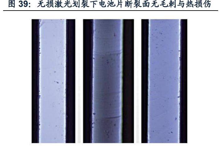 無損激光劃裂優(you) 勢顯著,有望成為(wei) 行業(ye) 新一代主流技術。無損激光劃裂技術具備截 斷麵幹淨、不存在損傷(shang) 點、加工產(chan) 生的矽粉塵數量少、抗彎強度保持不變等特點, 解決(jue) 了常規激光劃裂造成的電池片損傷(shang) 問題,能將切片前後電池性能損失降到最小, 助推組件輸出功率提升。對應無損激光劃裂設備,帝爾激光、海目星、奧特維等多 家公司已推出成熟產(chan) 品,隨著半片、疊瓦等高效光伏組件技術市場份額持續提升, 相關(guan) 設備有望持續放量。
