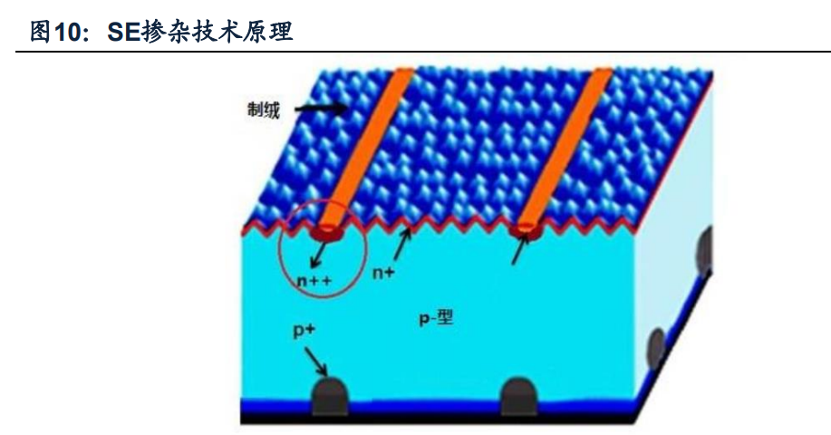 SE摻雜技術可有效解決(jue) 輕重摻雜選擇矛盾。SE摻雜全稱為(wei) 發射極選擇性摻雜,通過 在光伏電池電極柵線與(yu) 矽片接觸部位區域進行高濃度磷摻雜,從(cong) 而降低電極和矽片 之間的接觸電阻;並在電極以外區域進行低濃度淺摻雜,降低表麵複合速率,從(cong) 而 有效實現電池的開壓、電流和填充因子改善。SE摻雜技術兼顧輕重摻雜兩(liang) 者的優(you) 點, 有效提高了光電轉換效率。