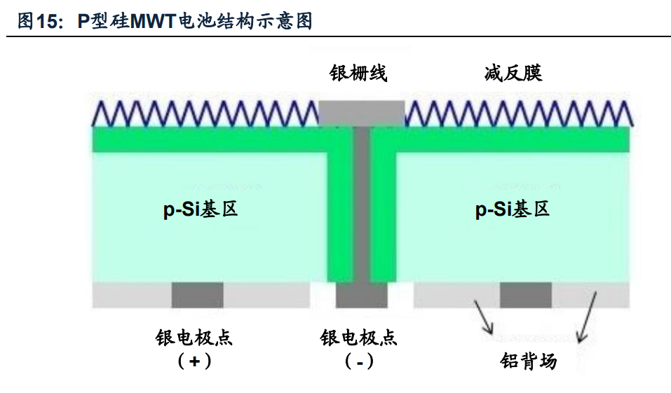 MWT激光開孔技術可用於(yu) PERC電池,提升光電轉換效率約0.4%。MWT全稱為(wei) 金 屬穿孔卷繞技術,采用激光打孔、背麵布線的技術消除正麵電極的主柵線,正麵電 極細柵線搜集的電流通過孔洞中的銀漿引到背麵。此設計下,光伏電池的正負電極 點都分布在電池片背麵,有效減少了正麵柵線的遮光,提高光電轉換效率,同時能 降低銀漿消耗量和金屬電極-發射極界麵的載流子複合損失,具備降本增效的功能。